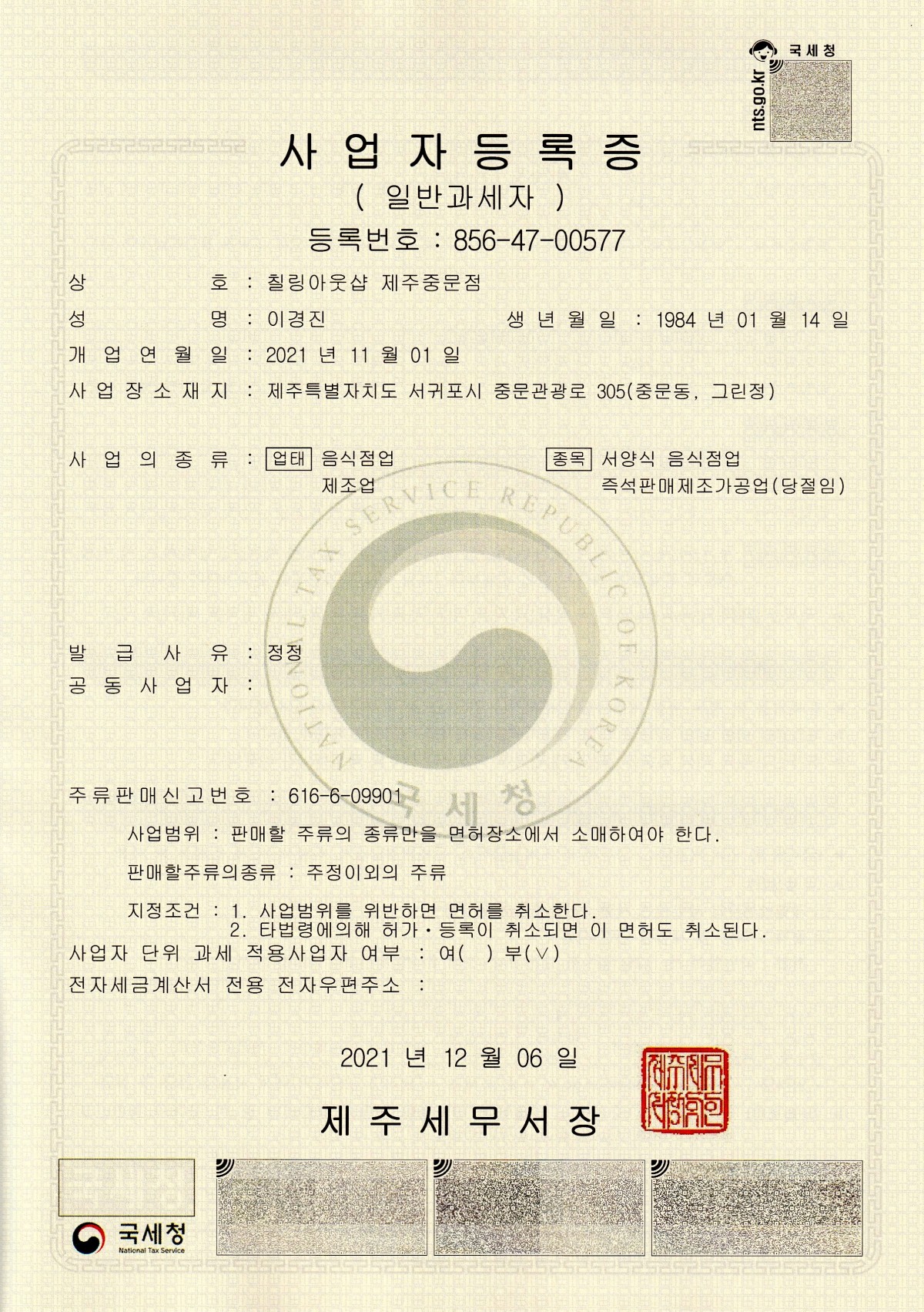 - 업태 : 음식점업